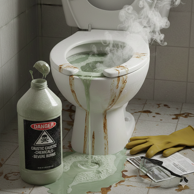 Sebagian besar obat pelancar WC mengandung bahan kimia keras seperti soda api (NaOH), asam kuat, atau zat korosif lainnya. Bahan tersebut bekerja dengan cara memanaskan dan melarutkan material penyumbat. Meski terdengar efektif, reaksi kimia ini dapat memberikan dampak berbahaya: